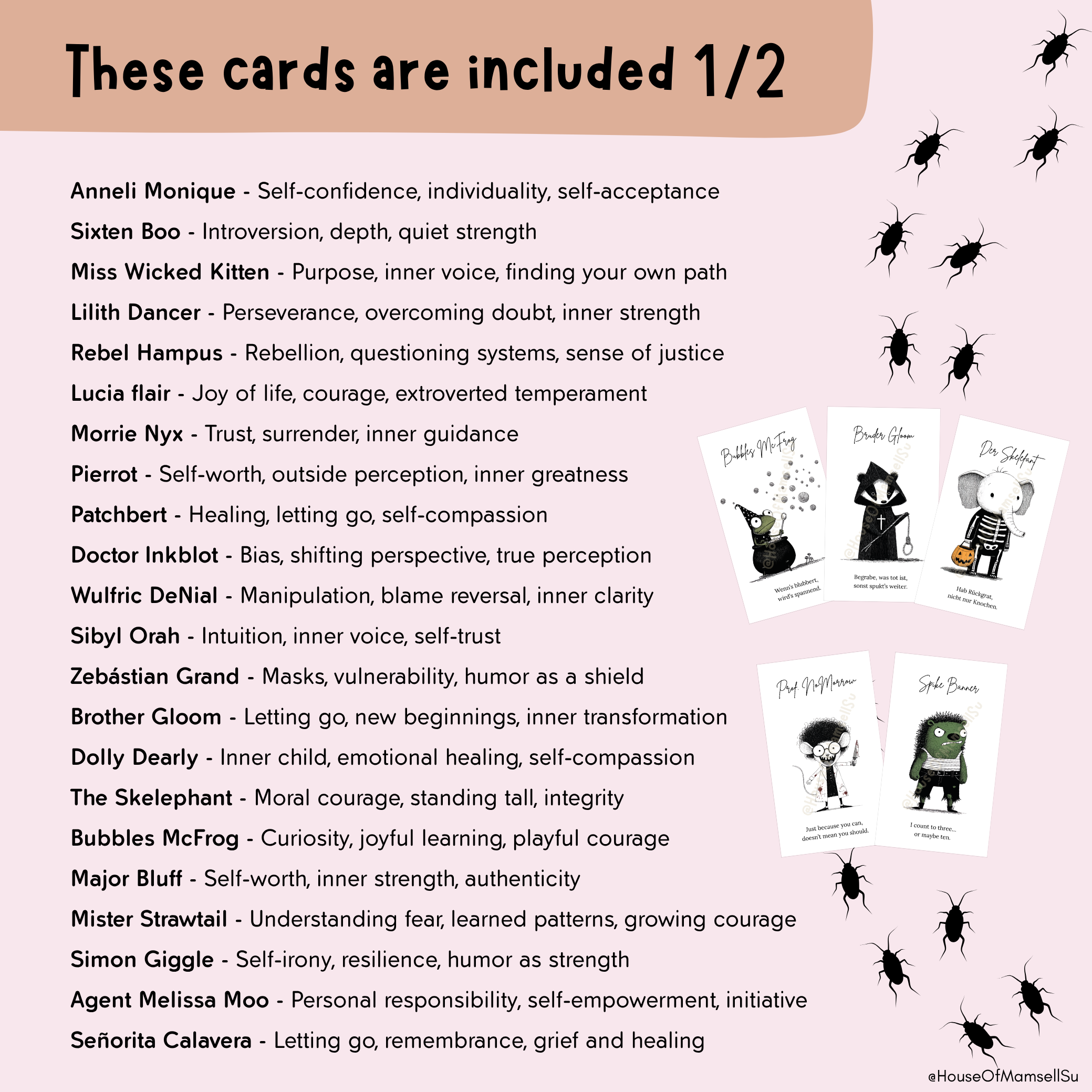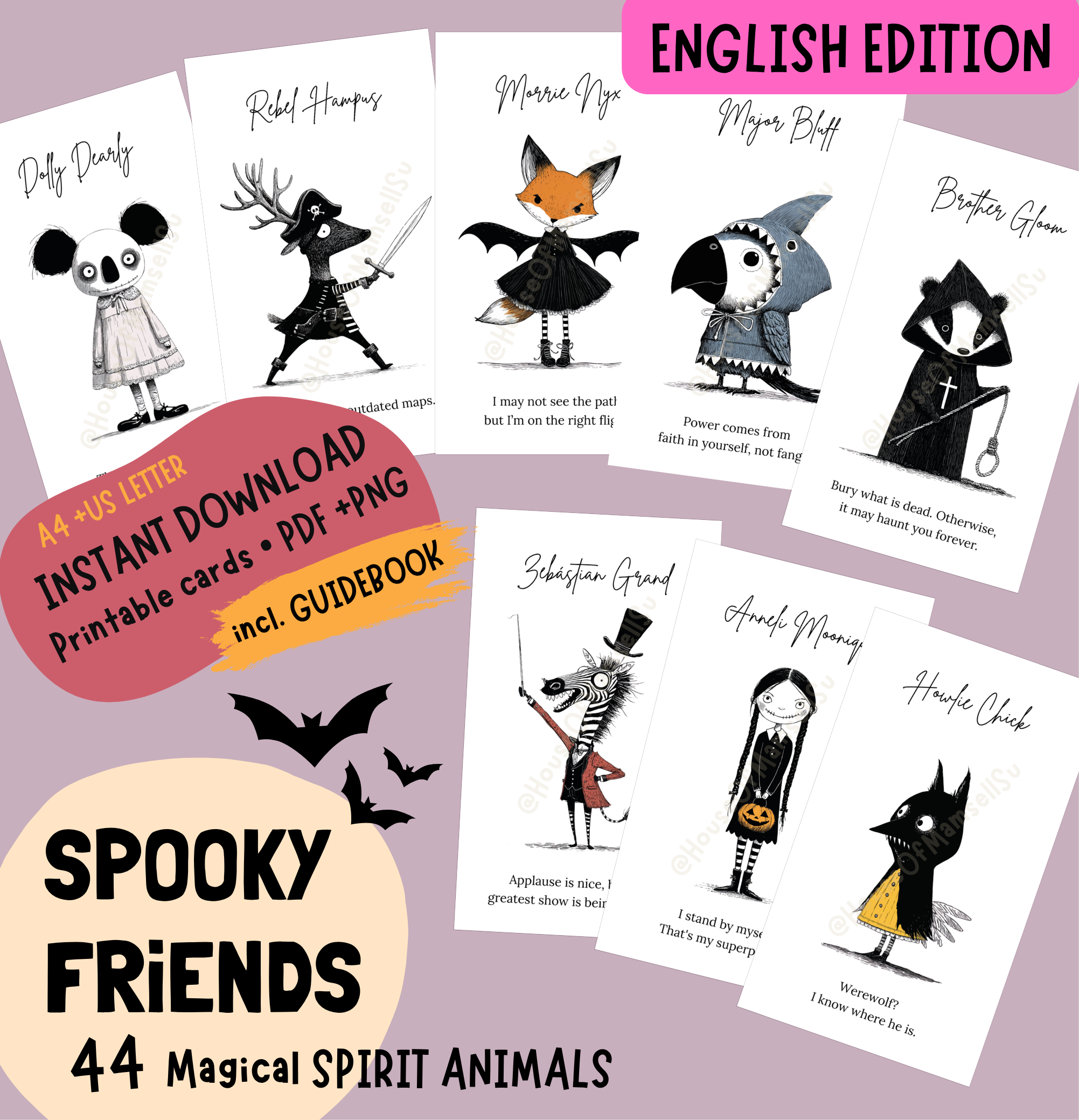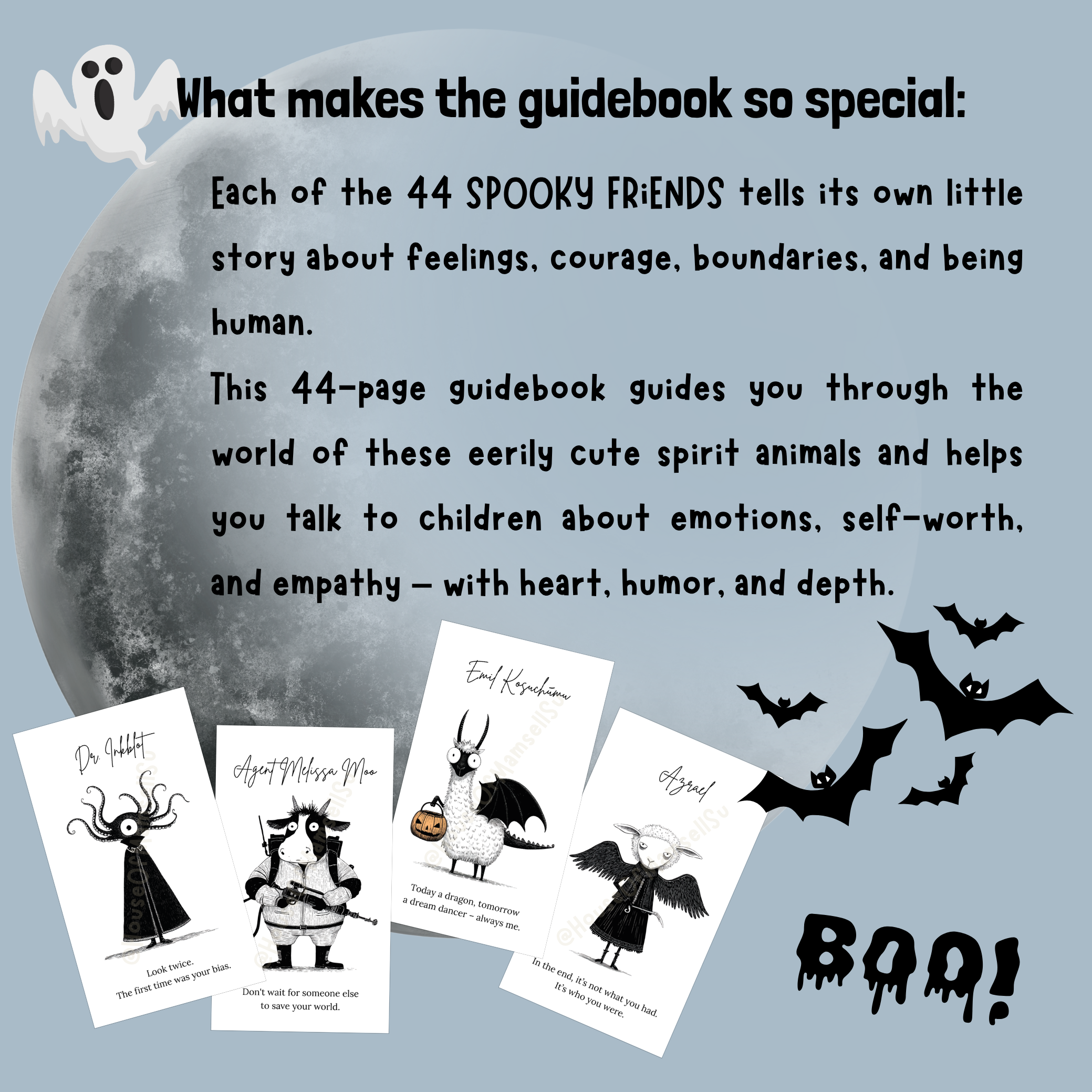Jede Karte zeigt eines der SPOOKY FRiENDS, ein liebevoll illustriertes schaurig niedliches Krafttier mit einer kleinen Geschichte, die im Guidebook erzählt wird.