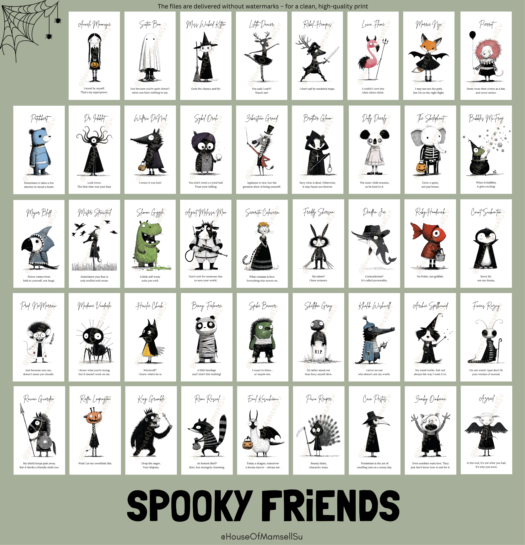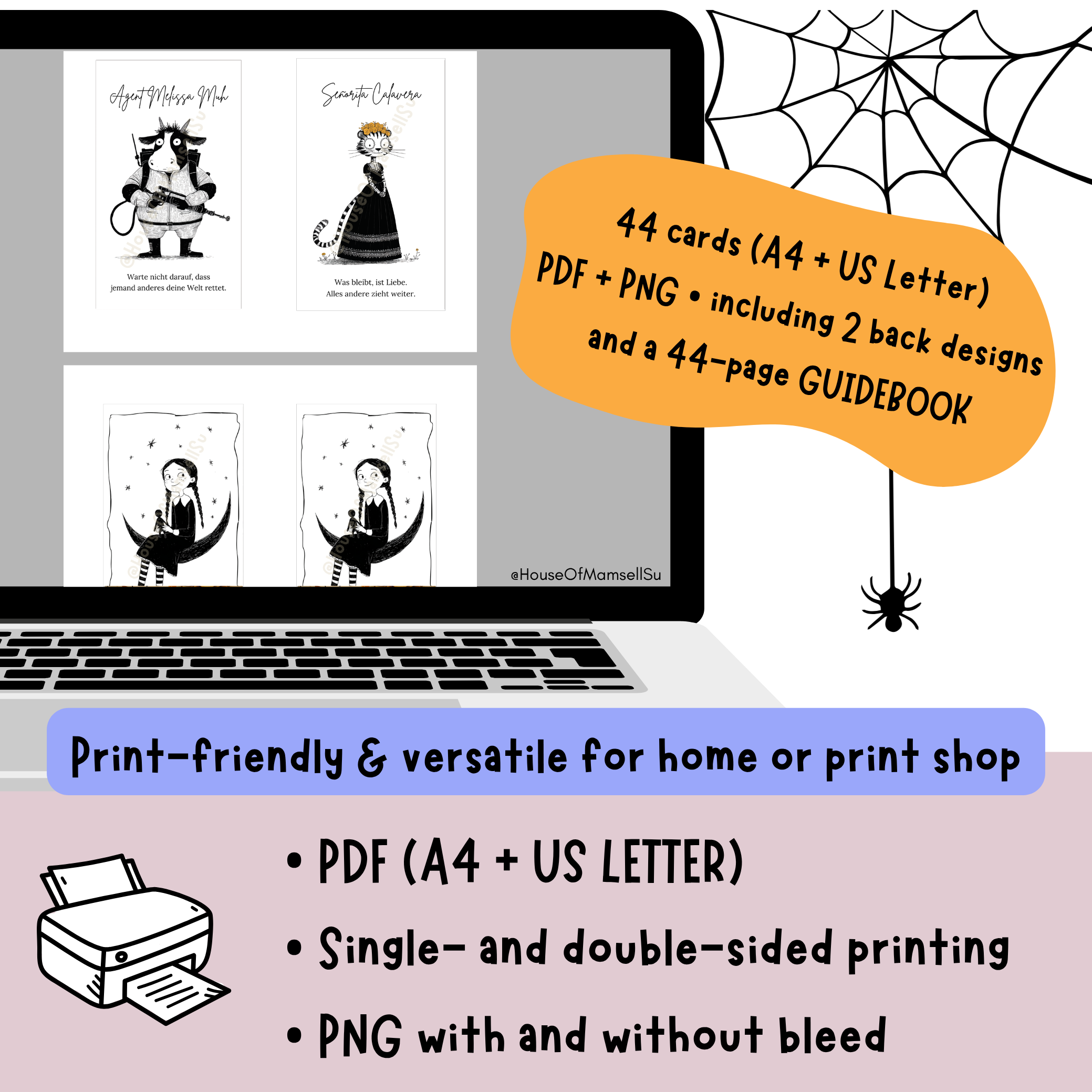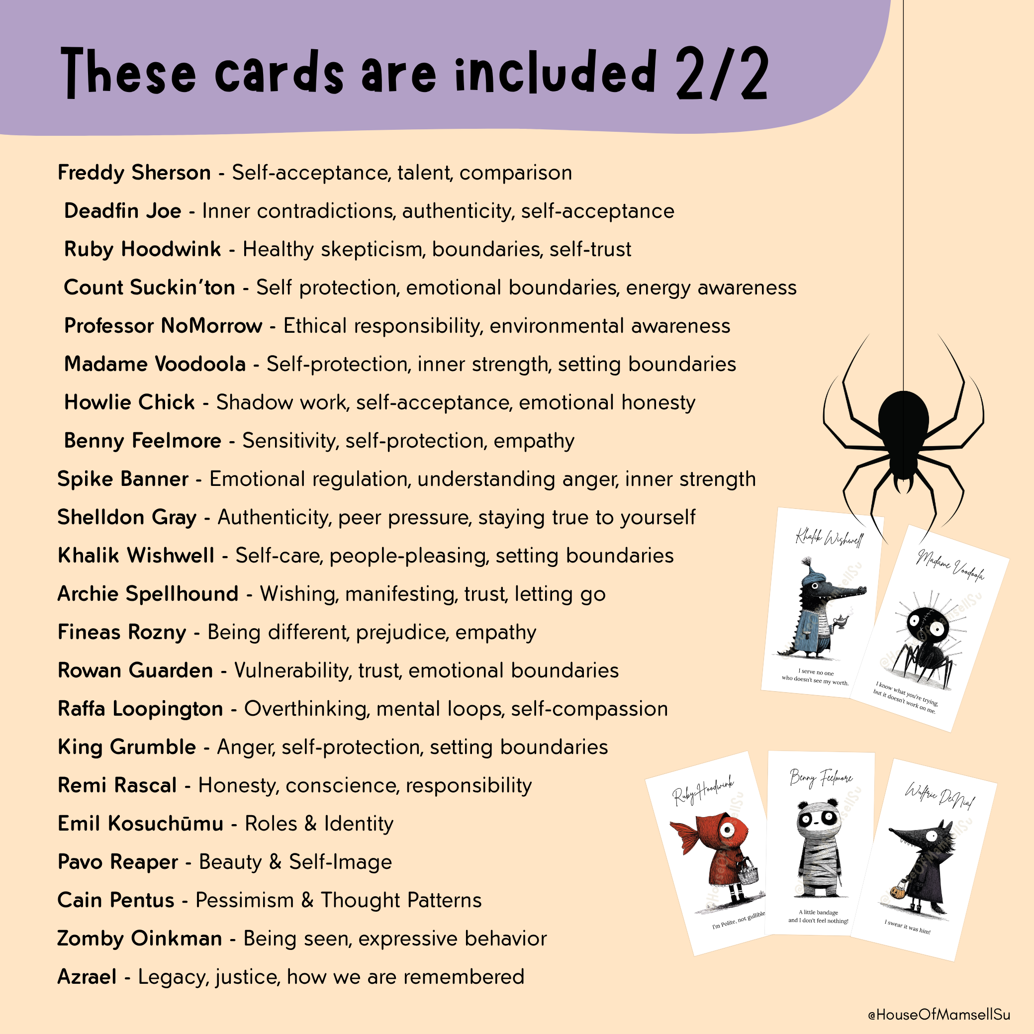 Jede Karte zeigt eines der SPOOKY FRiENDS, ein liebevoll illustriertes schaurig niedliches Krafttier mit einer kleinen Geschichte, die im Guidebook erzählt wird.